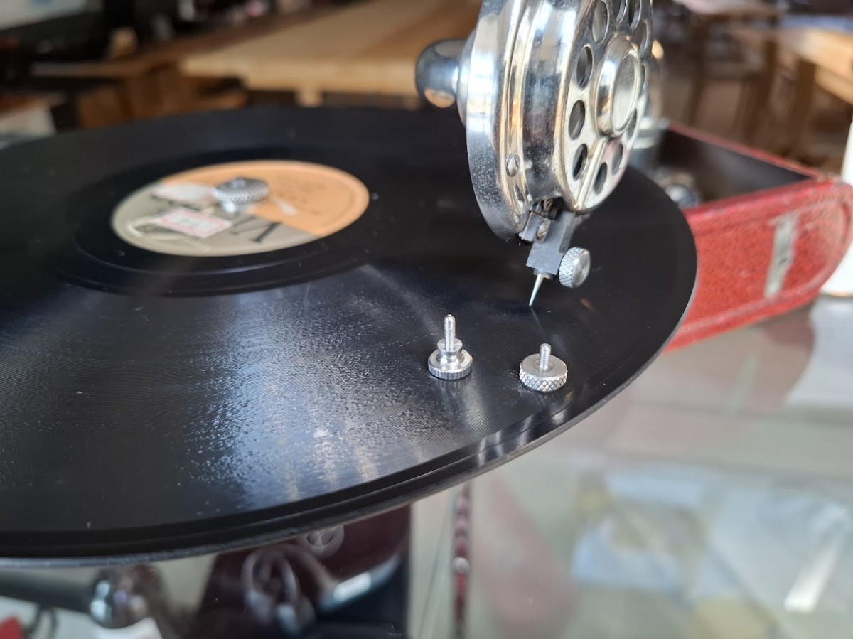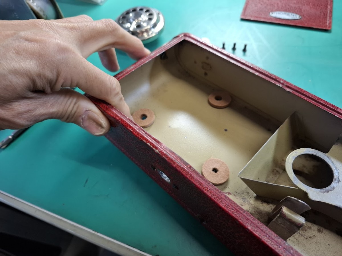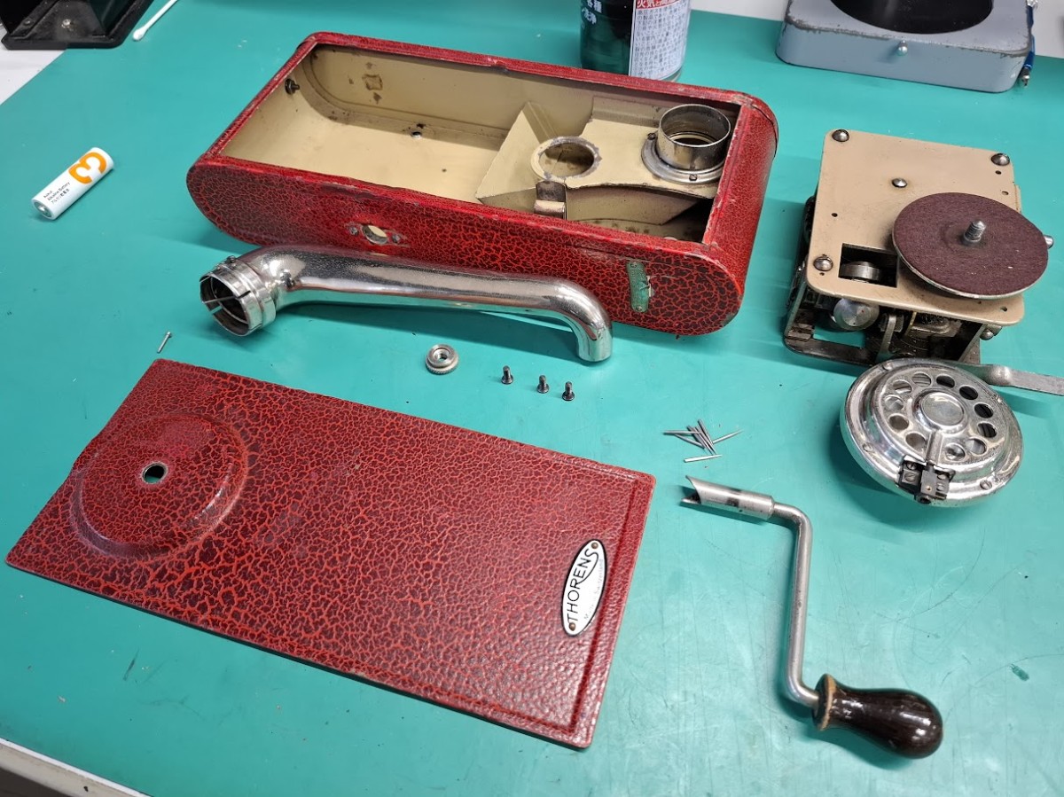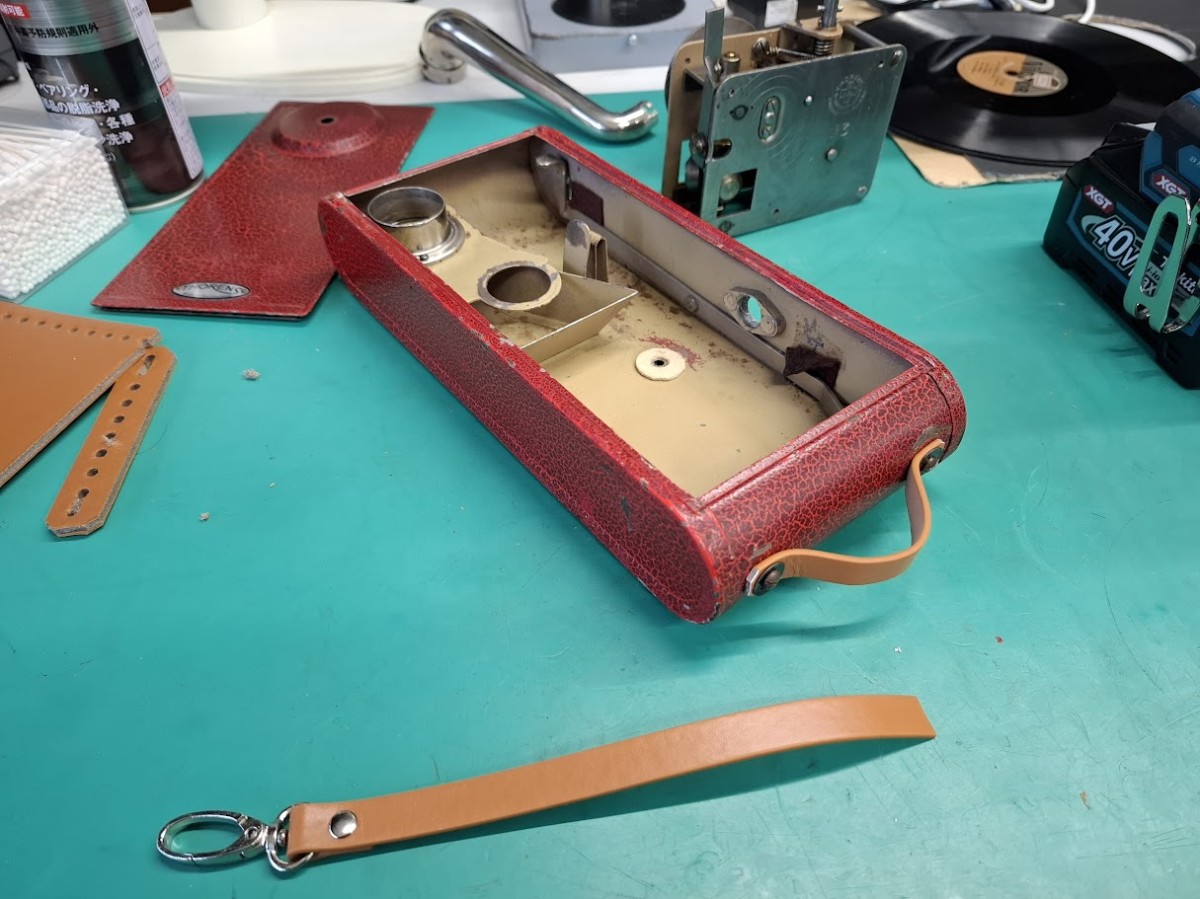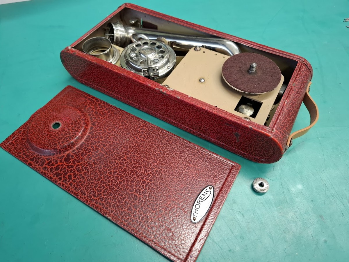 この個体の不具合は ①ゼンマイのねじを巻くとき、メカが動いてしまって巻きにくい ②サウンドボックスの針を止めるねじが折れて針が交換できない ③ハンドキャリーするときの皮の持ち手が切れてしまって無くなっている
