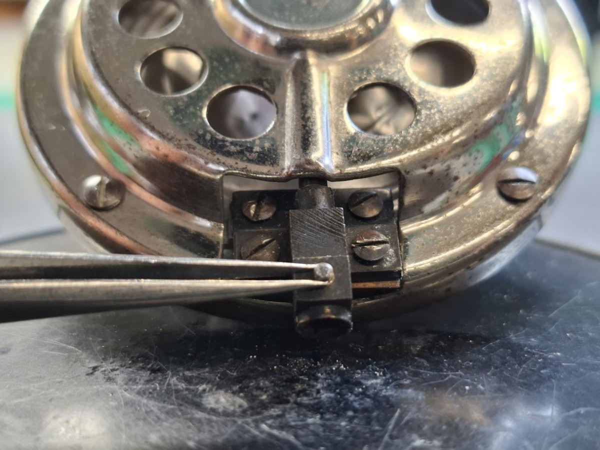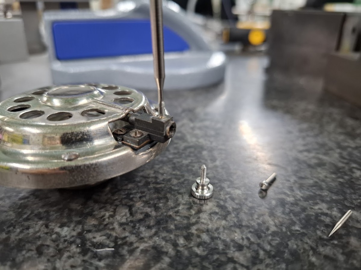 回転メカは、さすがスイス製。もう100年近く前の設計ですが、造りは非常に良い感じです。各歯車に着いた古いグリスを回転させながら、パーツクリーナーと爪楊枝で取り除いていきます。